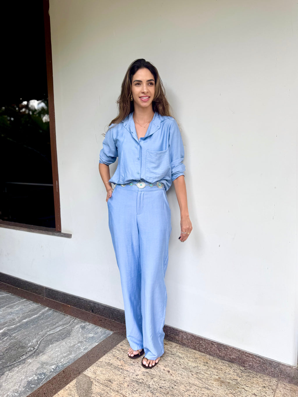 CONJUNTO FEMININO CALÇA E CAMISA AZUL CLARO